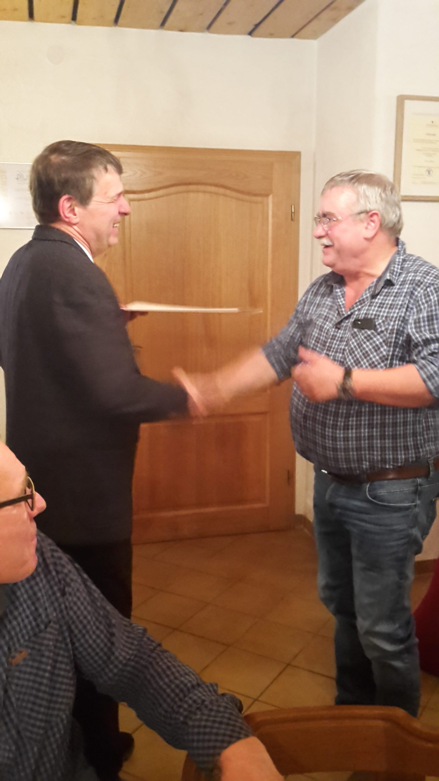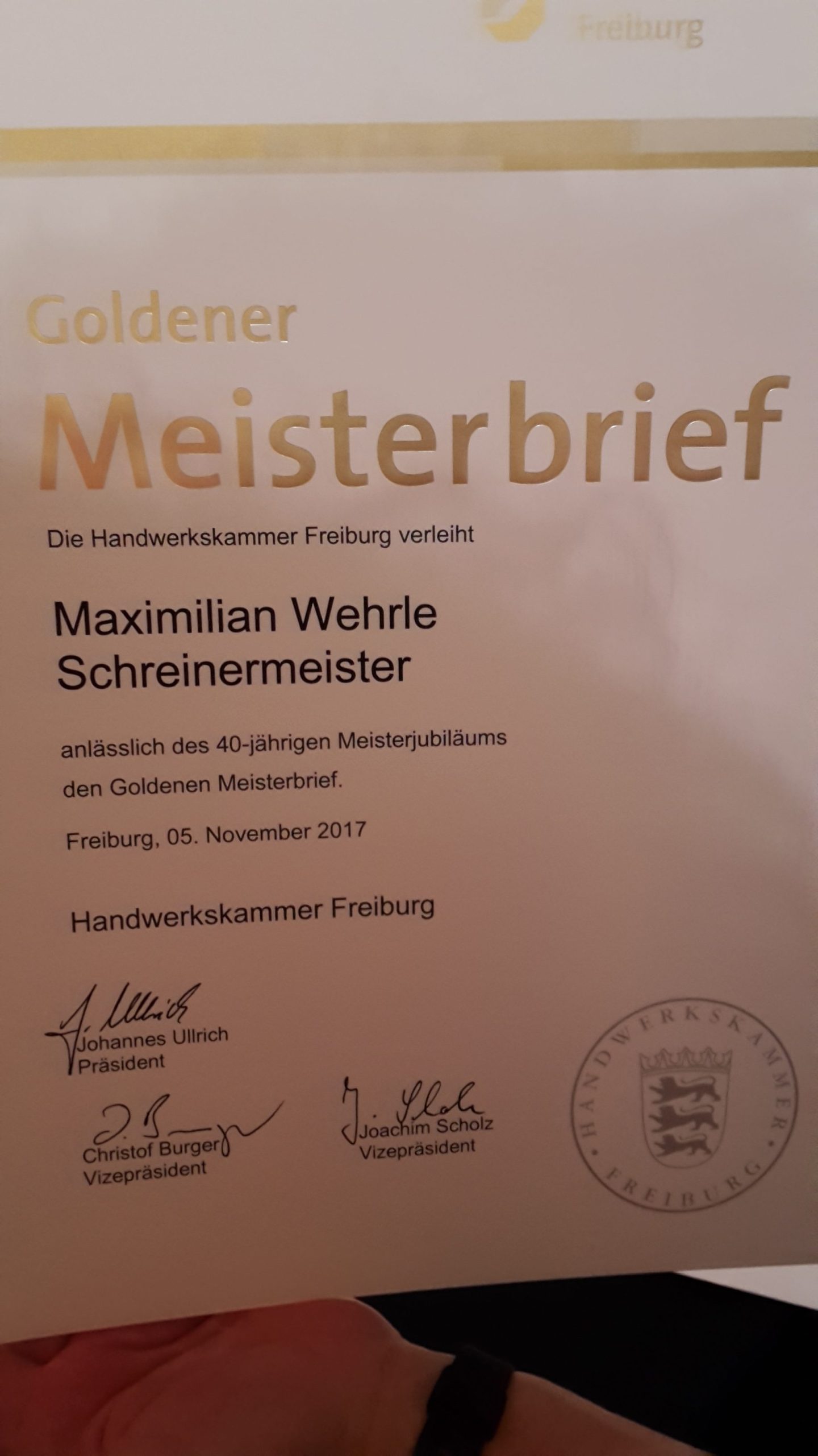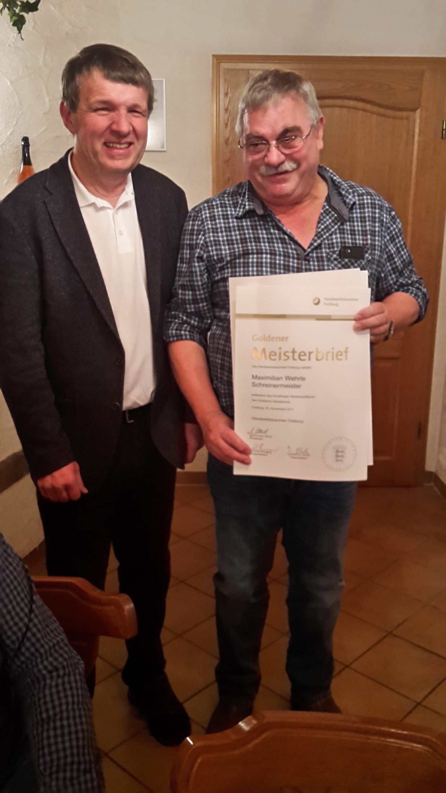 Max Wehrle von der Schreinerei Wehrle GmbH in Waldkirch bekam im Rahmen der Veranstaltung vom alten und neuen Obermeister Willi Reinbold eine Urkunde der HWK Freiburg eine Urkunde mit dem Goldenen Meisterbrief für 40 Jahre Meister im Schreinerhandwerk überreicht.